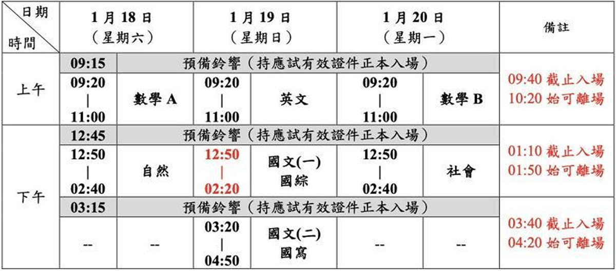 114學年度學科能力測驗將於114年1月18日(六)至1月20日(一)舉行,報名自113年10月29日(二)起至11月12日(二)截止。大考中心表示,高三學生一律由就讀學校辦理集體報名,非應屆生可委託經有集體報名單位代碼的補習班或自行個別報名。